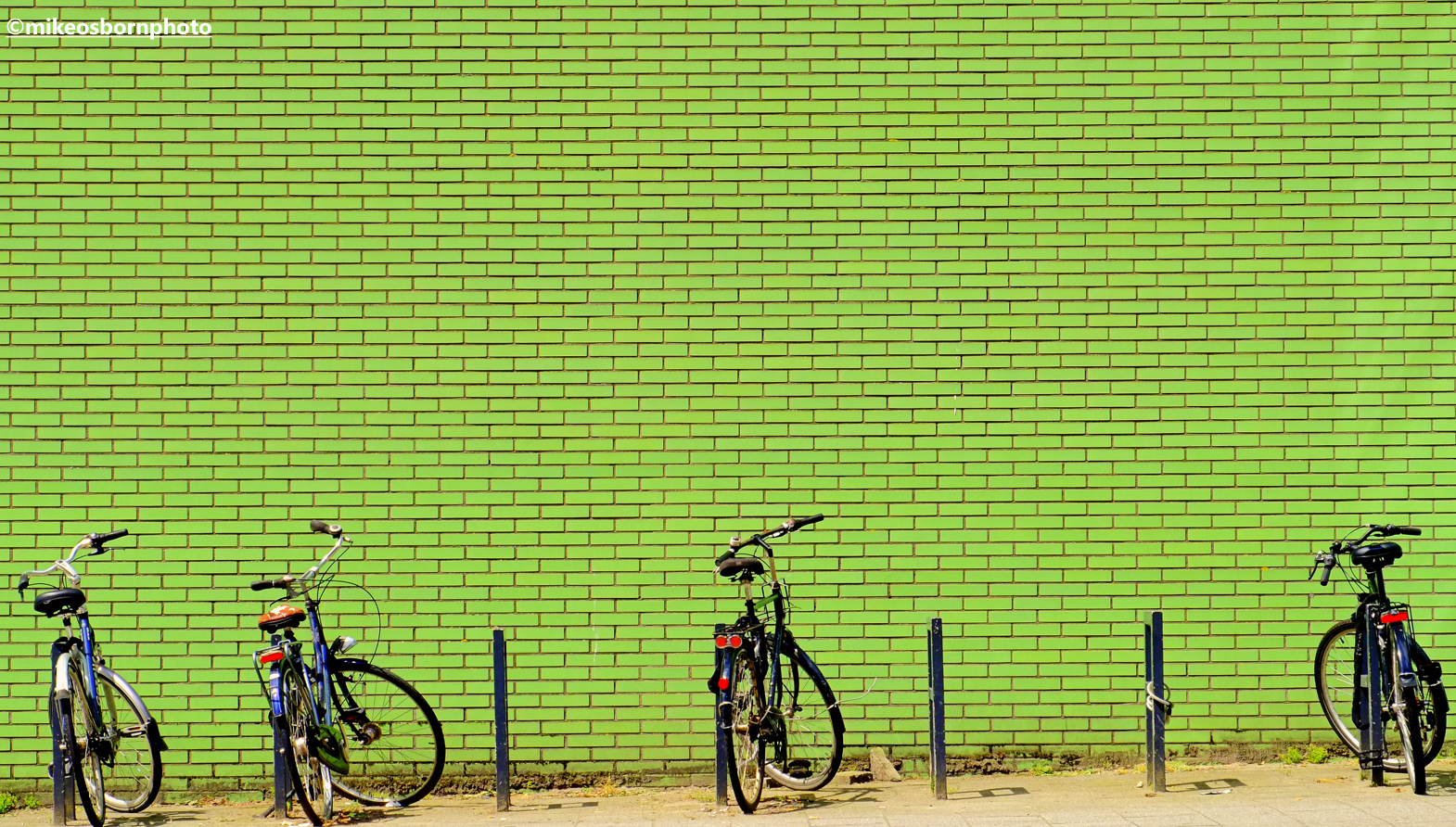 Bicycles in Rotterdam parked next to a green brick wall.