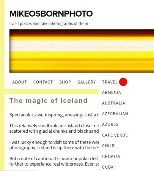 If you’re viewing on desktop, simply click on TRAVEL and the list of countries and destinations will appear for you to look at. Some have more than one post containing my travel impressions and of course photo galleries.